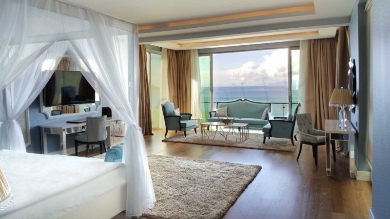 Протяжённость пляжа – 300 м. VIP-пляж с белым песком – 100 м. Заход в море – песок, галька, пирс. Душ, спасатель, кабинки для переодевания, бар на пляже.